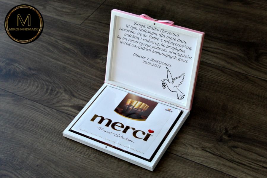 Dodaj wyjątkowego charakteru pamiątce komunijnej dzięki naszemu eleganckiemu pudełku na czekoladki „Merci”. To nie tylko praktyczny dodatek, ale przede wszystkim piękny gest płynący prosto z serca dziecka.