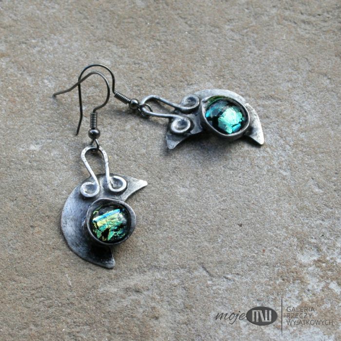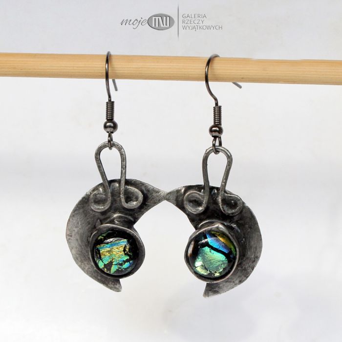 Kolczyki z motywem lunuli - księżyca. Zrobiłam je z miedzi pokrytej cyną, patynowanej i przecieranej. Zdobią je kaboszony, które wytopiłam ze szkła dichroicznego, które pięknie opalizuje w słonecznych promieniach. Zawieszone na metalowych biglach w kolorze grafitowym.