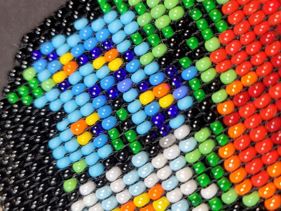 Technika: Ręczne tkactwo koralikowe (bead weaving) – niezwykle precyzyjna i trwała metoda.