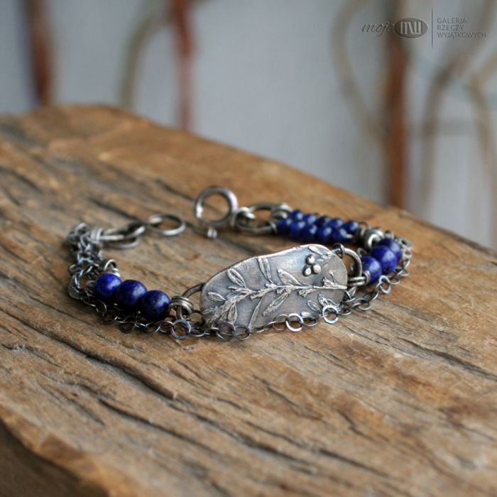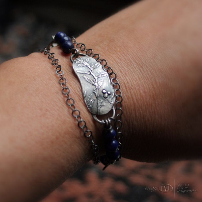 Bransoletka ze srebra i lapis lazuli. Ręcznie formowany element ze srebra wysokiej próby z bardzo realistycznym wizerunkiem polnej roślinki. Srebro jest oksydowane i przecierane dla wydobycia rysunku. Ozdobą są granatowe korale lapis lazuli - większe gładkie 5 mm i mniejsze fasetowane 3 mm. Całości dopełniają większe koła i drobniejszy łańcuszek.