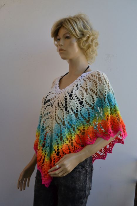 Poncho wykonane w całości ręcznie na szydełku z włóczki 50% bawełna, 50% akryl w kolorach różowy, żółty, zielony, turkusowy, kremowy i biały.