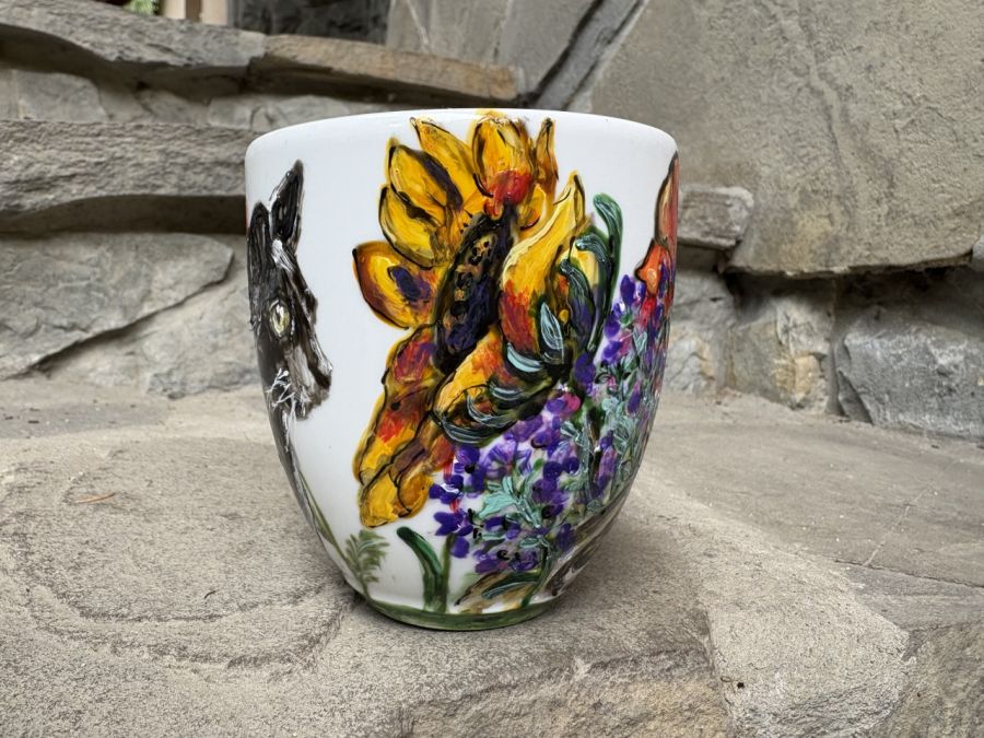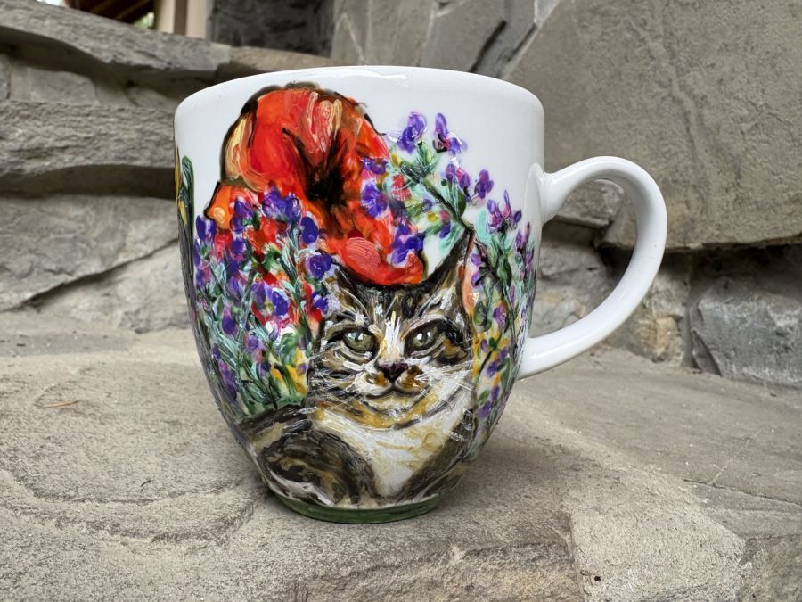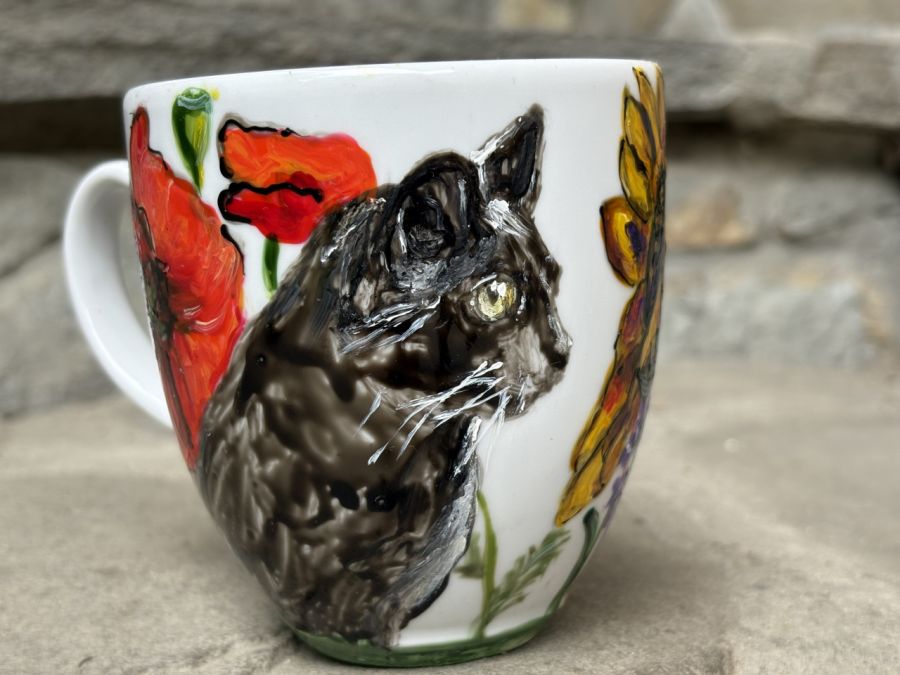 Zadaj pytanie dotyczące produktu: Porcelanowy kubek ręcznie malowany Koty i kwiaty