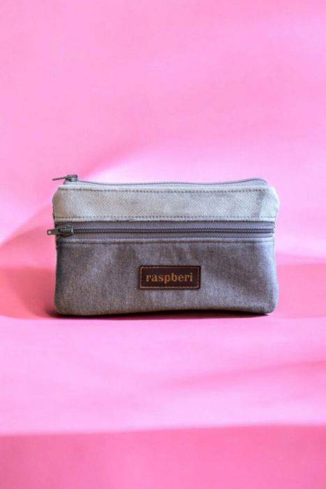 Prosty wodoodporny portfel wykonany z kilku rodzajów tkanin w odcieniach szarości.
