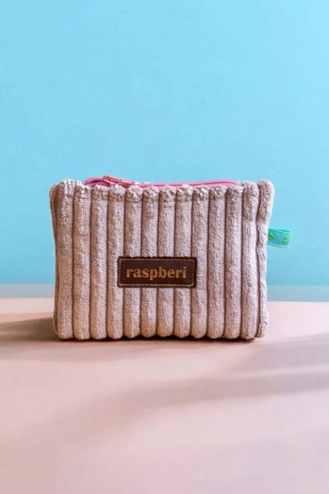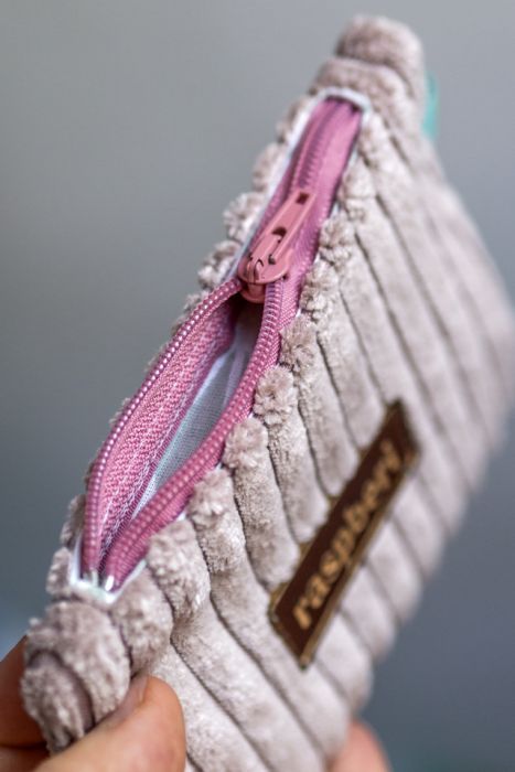 Prosty wodoodporny portfel wykonany z grubego pudroworóżowego sztruksu.
