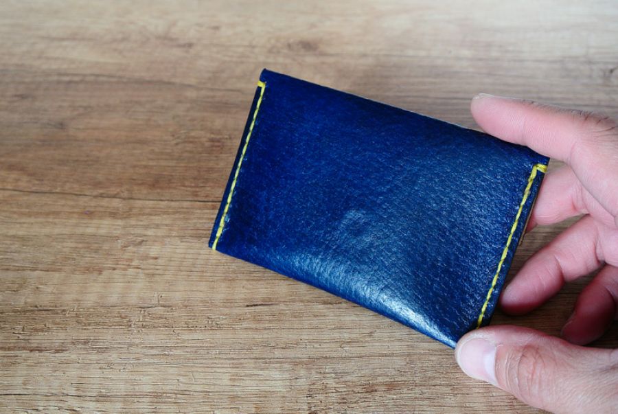 Portmonetka ręcznie wykonana ze skóry świńskiej, roślinnie garbowanej z polskich garbarni. Skóra ręcznie barwiona na kolor granatowy (royal blue). Szyta nićmi woskowanymi w kolorze żółtym. Zapinana na napę. Wnętrze w kolorze naturalnym.