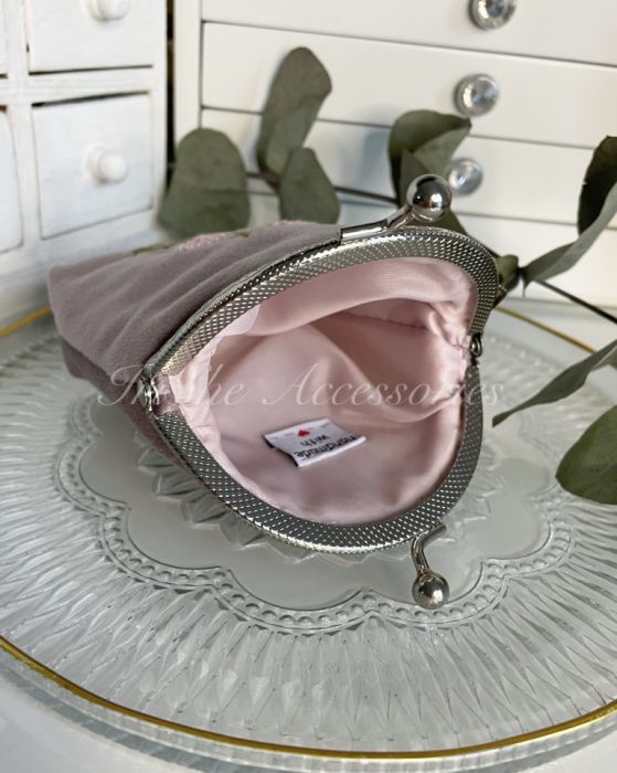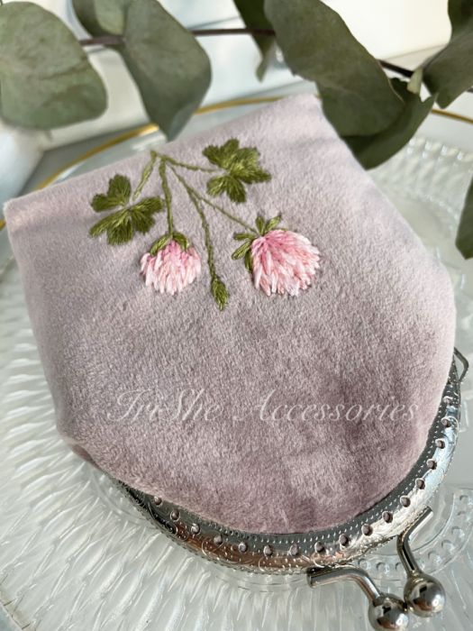 Welurowa portmonetka damska "Kwiat koniczyny" w kolorze pudrowego różu uszyta i haftowana ręcznie, lekka, miękka i przyjemna w dotyku. Idealnie sprawdzi się dla każdej kobiety ceniącej sobie ponadczasowy styl i oryginalność.