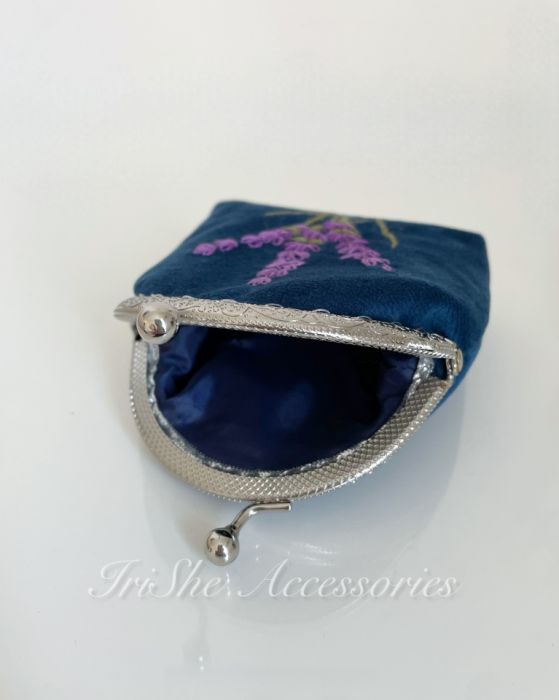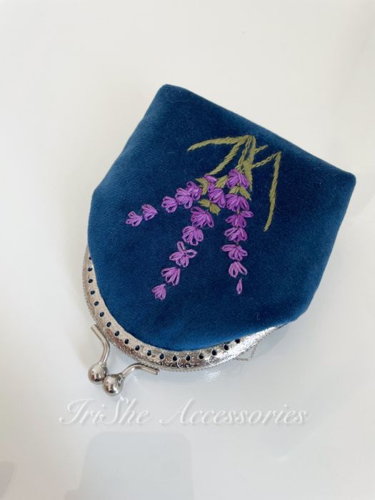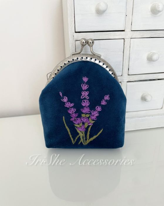 Elegancka Granatowa portmonetka "Lawenda" – uszyta w stylu Retro, ręcznie haftowana, wyjątkowo lekka i miękka, doskonała na każdą okazję!