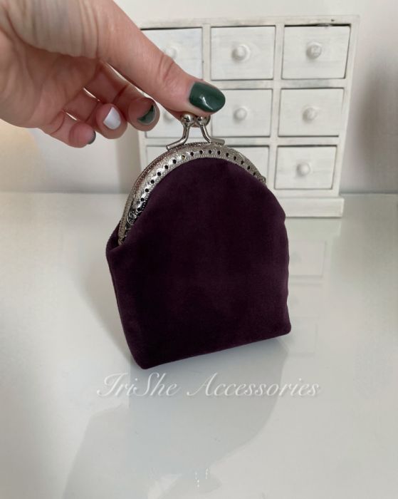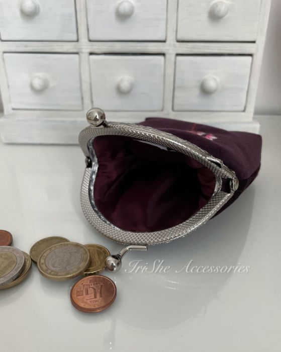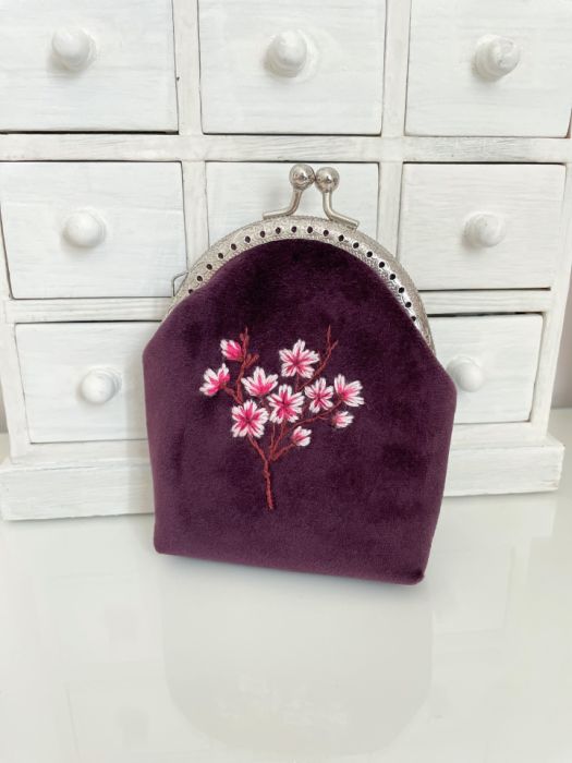 Elegancka portmonetka "Sakura" z autorskiej kolekcji portmonetek haftowanych w kolorze oberżyny (głęboki ciemny śliwkowy) – ręcznie uszyta i haftowana, wyjątkowo lekka i miękka, doskonała na każdą okazję!