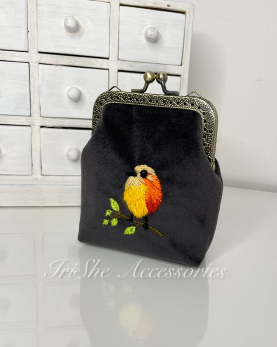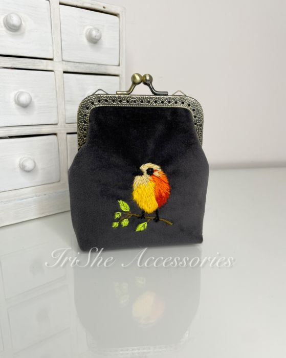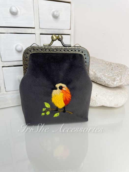 Elegancka portmonetka "Ptaszek" w kolorze antracyt – ręcznie uszyta i haftowana, wyjątkowo lekka i miękka, doskonała na każdą okazję!