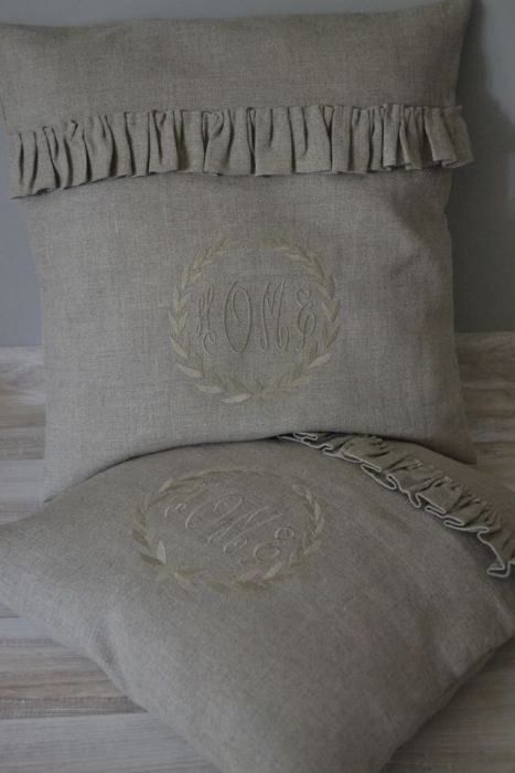 Poszewka uszyta z lnu z ozdobnym haftem HOME i falbanką, w tyle zapinana drewniany guzik. Poszewka ozdobi każde wnętrze.