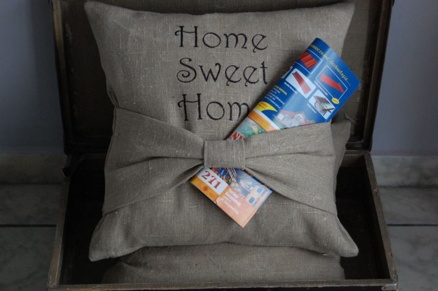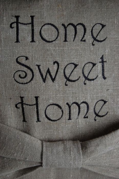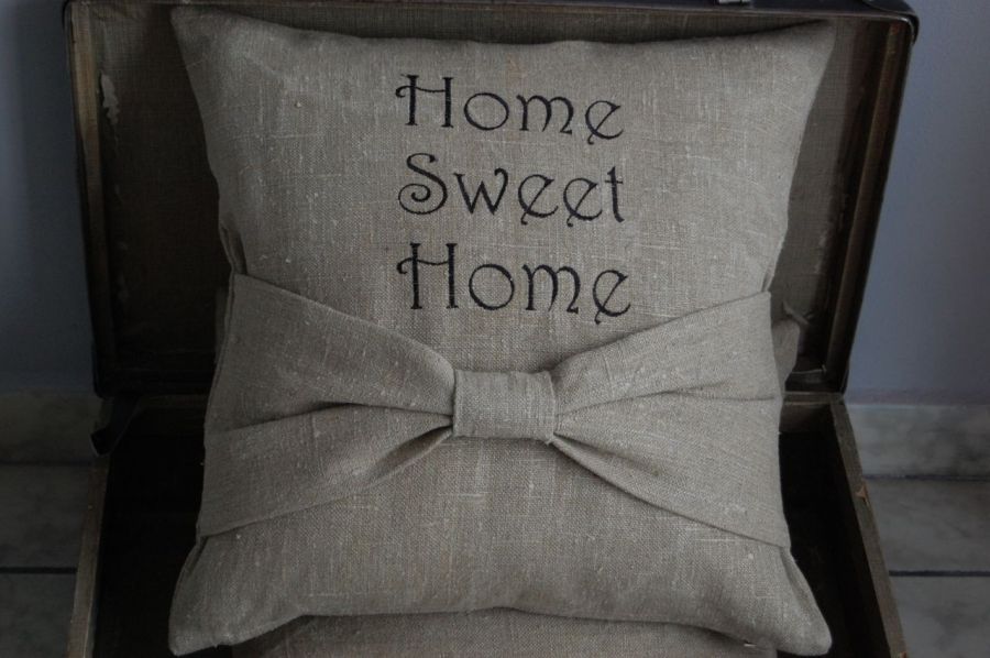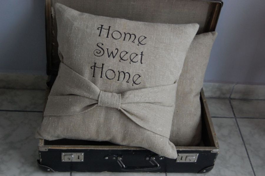 Poszewki "Home sweet home" - poszewki na poduszki wykonane z grubego, surowego lnu, z wyhaftowanym czarnym napisem "Home sweet home" zapinane na zamek błyskawiczny. Dodatkową ozdobą jest duża lniana kokarda, która poza funkcją dekoracyjną może być miejscem na odłożenie książki/gazety w stanach błogiego odpoczynku lub skrajnego lenistwa :)
