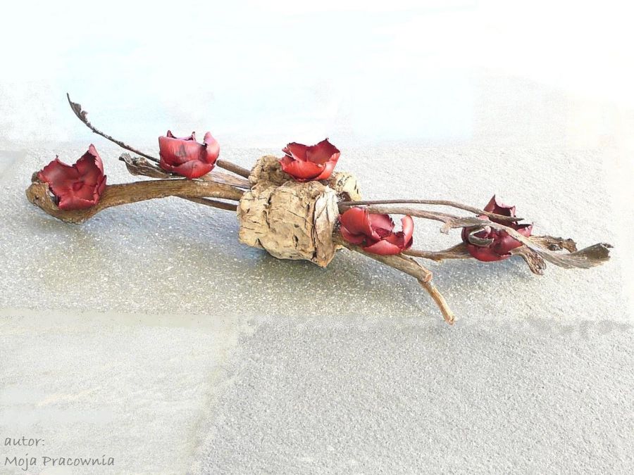 Podłużna (ok. 77 cm) dekoracja na stół, w stonowanej bordowo-kremowo-brązowej kolorystyce, wykonana z kory i suszu egzotycznego.