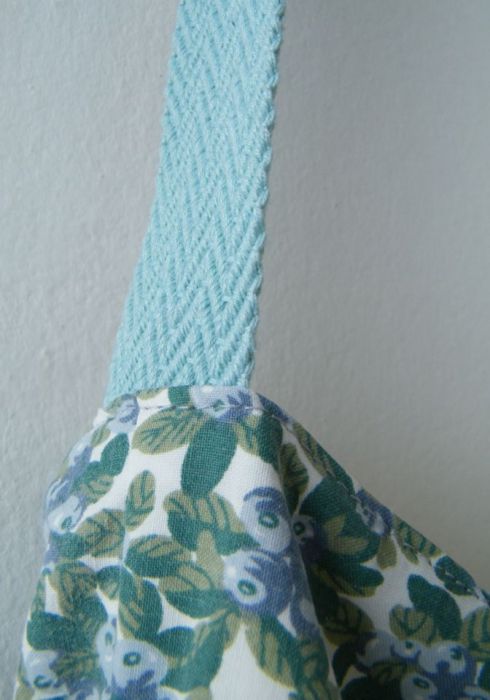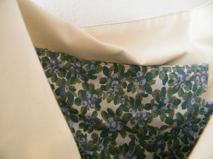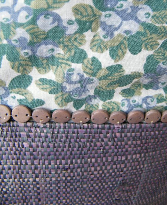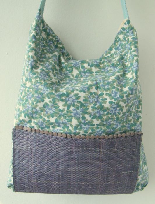 Obszerna torba ( 40/45 cm) na ramię uszyta z bawełny. Ma dwie zewnętrzne kieszenie ze słomkowej podkładki ozdobionej drewnianymi koralikami i jedną wewnętrzną- bawełnianą. Długi pasek z bawełnianej, mocnej taśmy wygodnie leży na ramieniu.