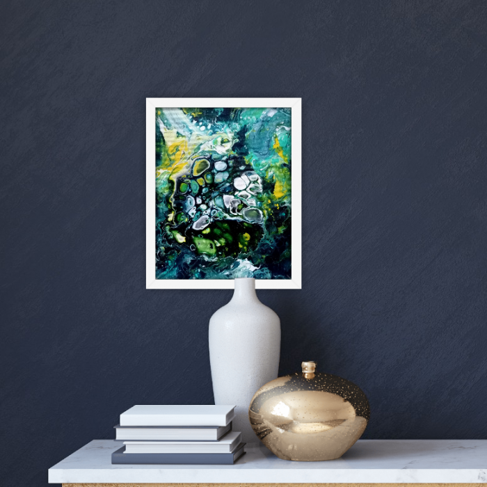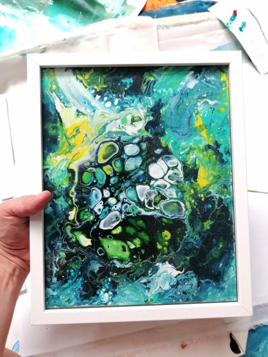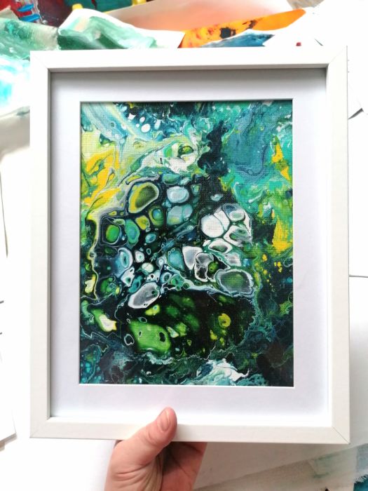 Obraz abstrakcyjny wykonany techniką pouringu akrylowego, która polega na rozcieńczaniu farby, mieszaniu jej z silikonem i podgrzewaniu całości do wysokiej temperatury. Obraz jest unikatem - nie ma możliwości uzyskania drugiego podobnego wzoru. Ciekawa kompozycja przypominająca układy komórek cieszy oko i przyciąga uwagę. Pracę oprawiam w minimalistyczną białą ramkę, która w elegancki sposób eksponuje kolory. Obraz można łatwo zawiesić na ścianie lub postawić na półce. Całość stanowi unikatowy i stylowy prezent na urodziny, imieniny lub Boże Narodzenie!