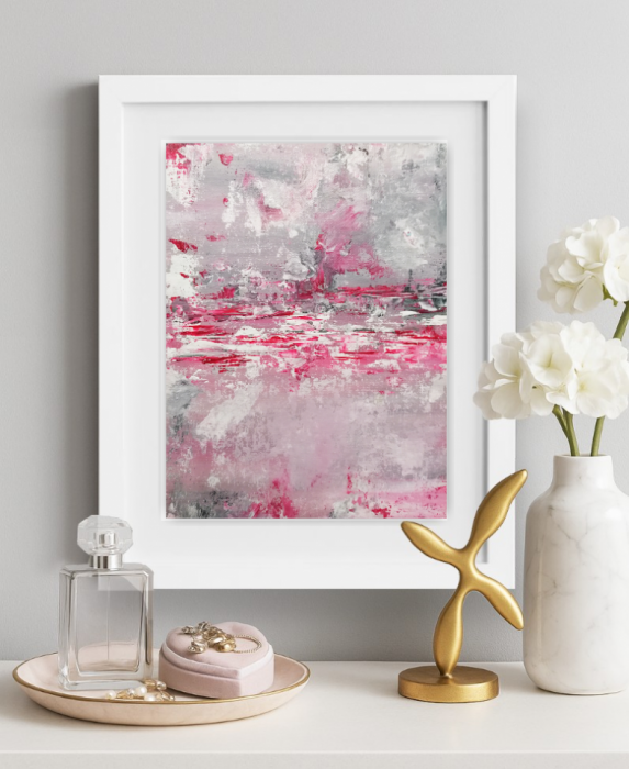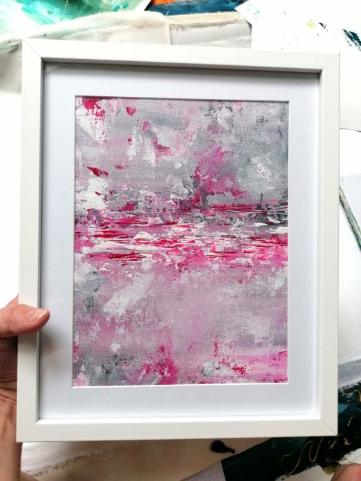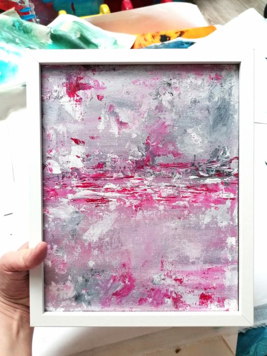 Abstrakcja w subtelnych odcieniach różu, szarości i bieli. Chłodne kolory i statyczna kompozycja wprowadzą do wnętrza spokój i z pewnością przyciągną uwagę gości. Charakterystyczną teksturę uzyskałam, nakładając grube warstwy farby szpachelką malarską. Pracę oprawiam w minimalistyczną białą ramkę, która w elegancki sposób eksponuje kolory. Obraz można łatwo zawiesić na ścianie lub postawić na półce. Całość stanowi unikatowy i stylowy prezent na urodziny, imieniny lub Boże Narodzenie!