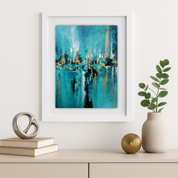 Abstrakcja, która przywodzi na myśl świat ukryty pod powierzchnią wody. Chłodne kolory i statyczna kompozycja wprowadzą do wnętrza spokój i z pewnością przyciągną uwagę gości. Złote akcenty pięknie odbijają światła i sprawiają, że obraz zdaje się żyć własnym życiem. Charakterystyczną teksturę uzyskałam, nakładając grube warstwy farby szpachelką malarską. Pracę oprawiam w minimalistyczną białą ramkę, która w elegancki sposób eksponuje kolory. Obraz można łatwo zawiesić na ścianie lub postawić na półce. Całość stanowi unikatowy i stylowy prezent na urodziny, imieniny lub Boże Narodzenie!