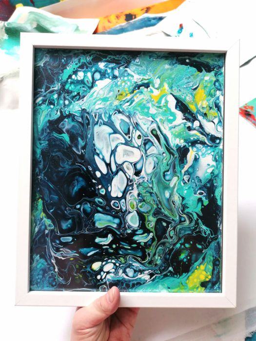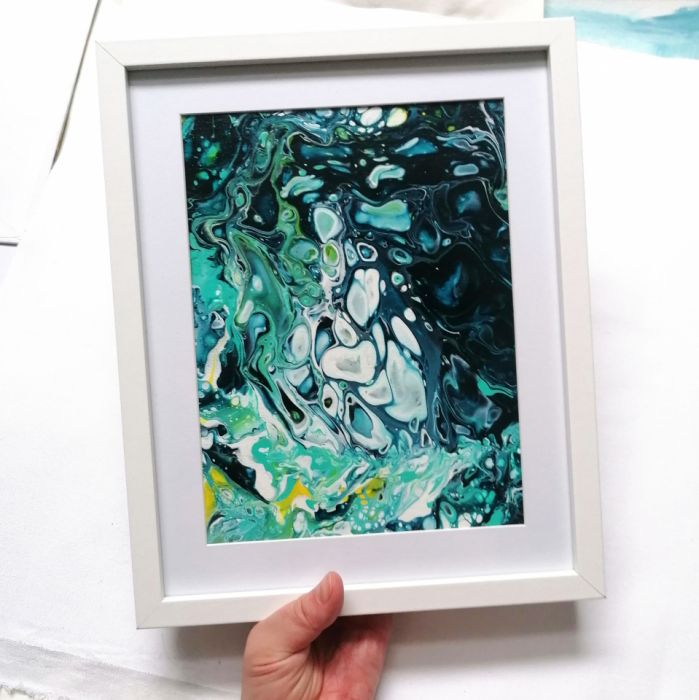 Obraz abstrakcyjny wykonany techniką pouringu akrylowego, która polega na rozcieńczaniu farby, mieszaniu jej z silikonem i podgrzewaniu całości do wysokiej temperatury. Obraz jest unikatem - nie ma możliwości uzyskania drugiego podobnego wzoru. Ciekawa kompozycja przypominająca układy komórek cieszy oko i przyciąga uwagę. Pracę oprawiam w minimalistyczną białą ramkę, która w elegancki sposób eksponuje kolory. Obraz można łatwo zawiesić na ścianie lub postawić na półce. Całość stanowi unikatowy i stylowy prezent na urodziny, imieniny lub Boże Narodzenie!