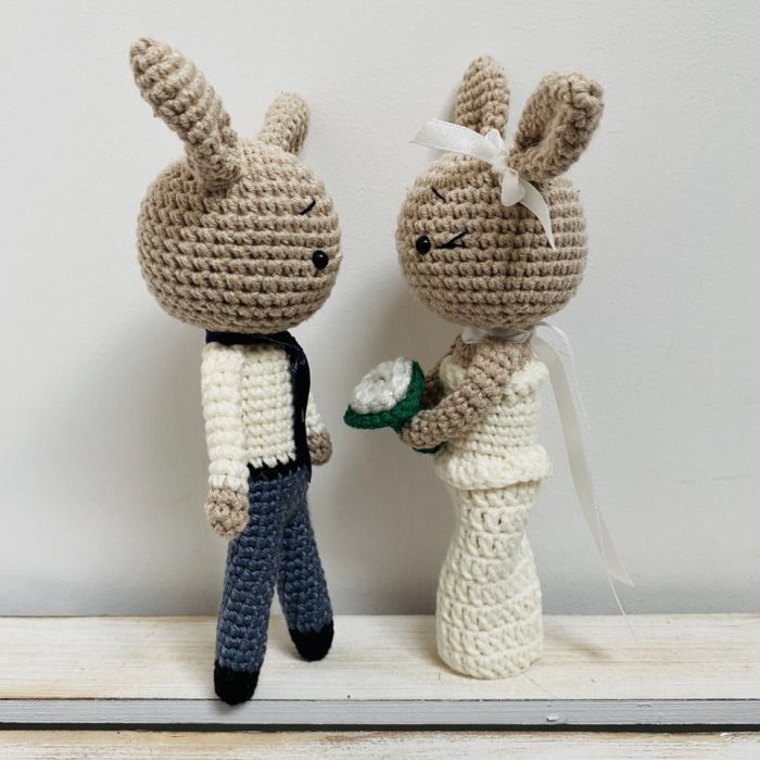Młoda Para - króliczki maskotki, wykonane ręcznie na szydełku z wysokiej jakości bawełny i akrylu anti-pilling (niemechacący się) z certyfikatem OEKO-TEX Standard 100, wypełnione antyalergicznym wkładem poduszkowym..