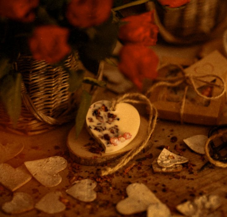 Walentynkowy zestaw o romantycznym zapachu składający się ze świecy sojowej, wosków do kominka w kształcie serc oraz sojową zawieszką do szafy w kształcie serca.
