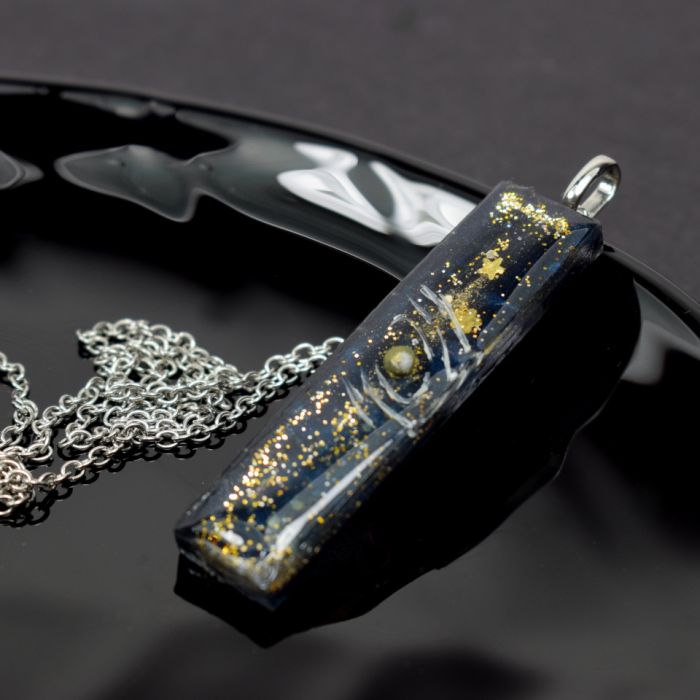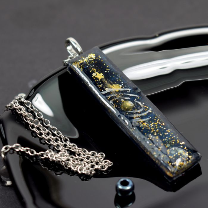 Każdy egzemplarz powstaje w mozolnym, wieloetapowym procesie artystycznym. Wisiorek tworzony jest warstwowo z żywicy epoksydowej, co daje efekt głębi i przestrzenności - jakbyś patrzył w sam środek galaktyki. Złote refleksy delikatnie migoczą w świetle, imitując odległe gwiazdy, zatopione w aksamitnym granacie kosmosu.