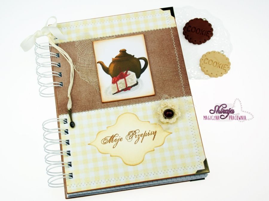 Wyjątkowy notes w formacie A5 na przepisy kulinarne. Wykonany własnoręcznie. Utrzymany w kolorystyce waniliowo-czekoladowej.. Uroku dodaje grafika z serniczkiem (projekt autorski) oraz metalowa zawieszka i szydełkowy kwiat. W środku ok. 100 kartek w kratkę (niektóre stemplowane) , kieszonka na luźne kartki i zakładka