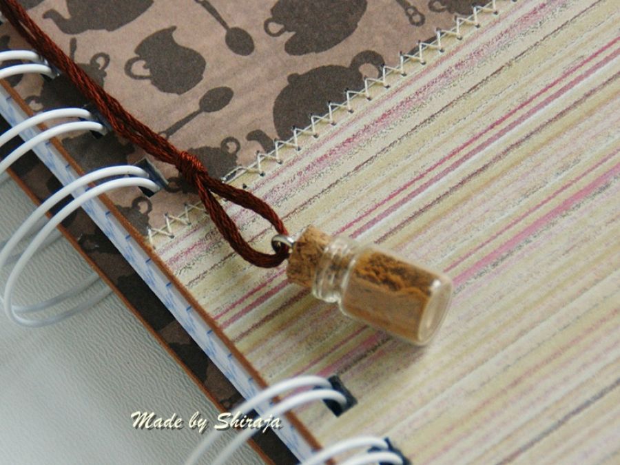 Wyjątkowy notes w formacie A5 na przepisy kulinarne. Wykonany własnoręcznie. Uroku dodaje motyw babeczek oraz zawieszka- buteleczka wypełniona aromatycznym cynamonem. W środku ok. 100 kartek w kratkę, kieszonka na luźne kartki.