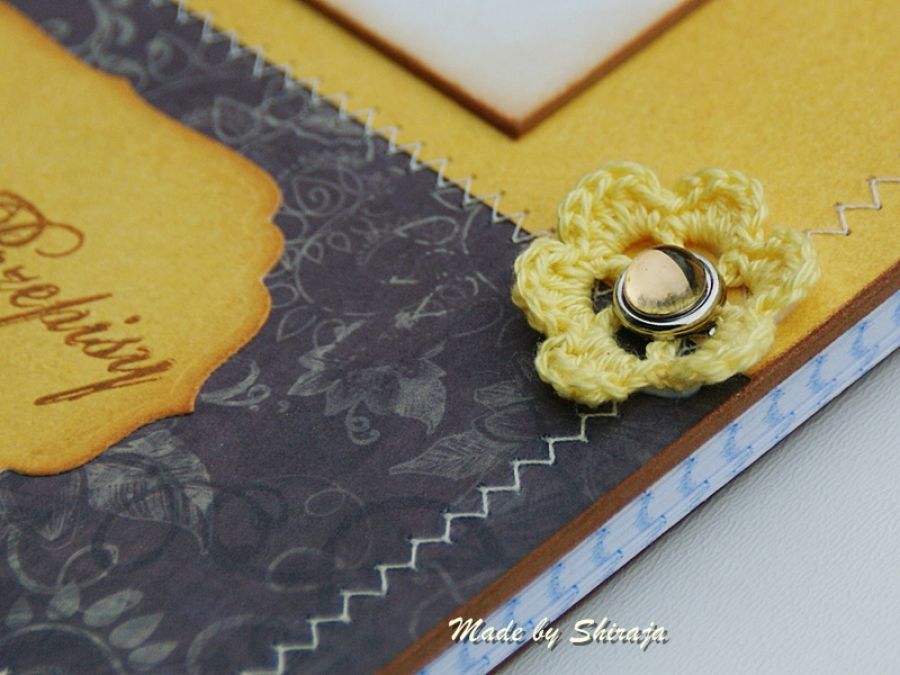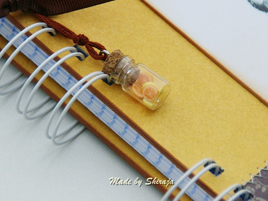 Notes formatu A5 wykonany z papierów do scrapbookingu utrzymanych w kolorystyce cytrynowo-czekoladowej. Obszywany maszynowo, ozdobiony rysunkiem zabawną pszczółką (projekt autorski) oraz zawieszką buteleczką wypełnioną plasterkami cytryny i pomarańczy W środku kieszonka na luźne notatki i ok 100szt kartek w kratkę.