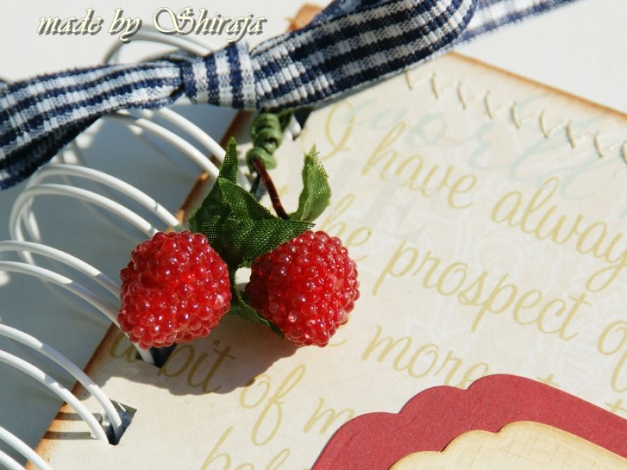 Wyjątkowy notes w formacie A5 na przepisy kulinarne . Wykonany własnoręcznie. Ozdobiony papierem do scrapbookingu z motywem owoców i kwiatów. Uroku dodaje malinowa przywieszka