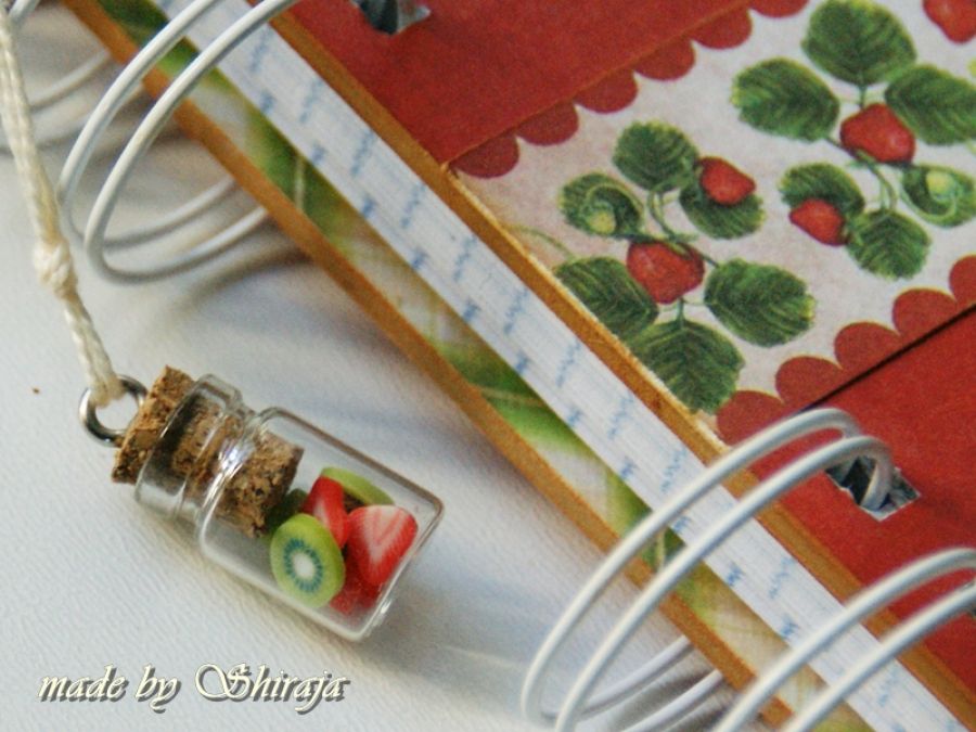 Notes formatu A5 wykonany z papierów do scrapbookingu utrzymanych w kolorystyce zielono-czerwonej. Obszywany maszynowo, ozdobiony grafiką z truskawkami, oraz szydełkowym kwiatem zawieszką- buteleczką wypełnioną plasterkami truskawek i kiwi. W środku ok 100szt. kartek w kratkę .