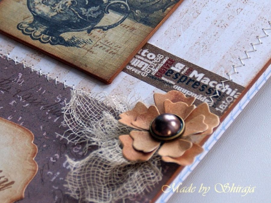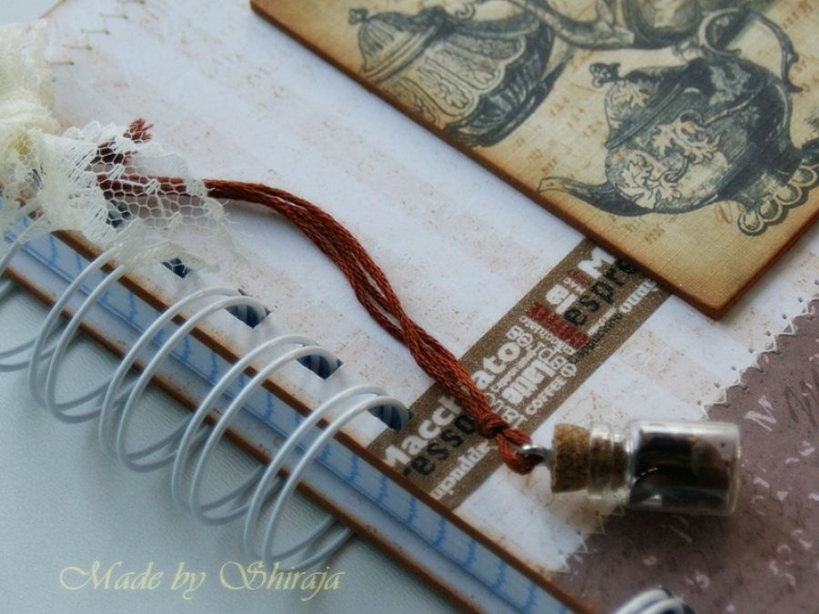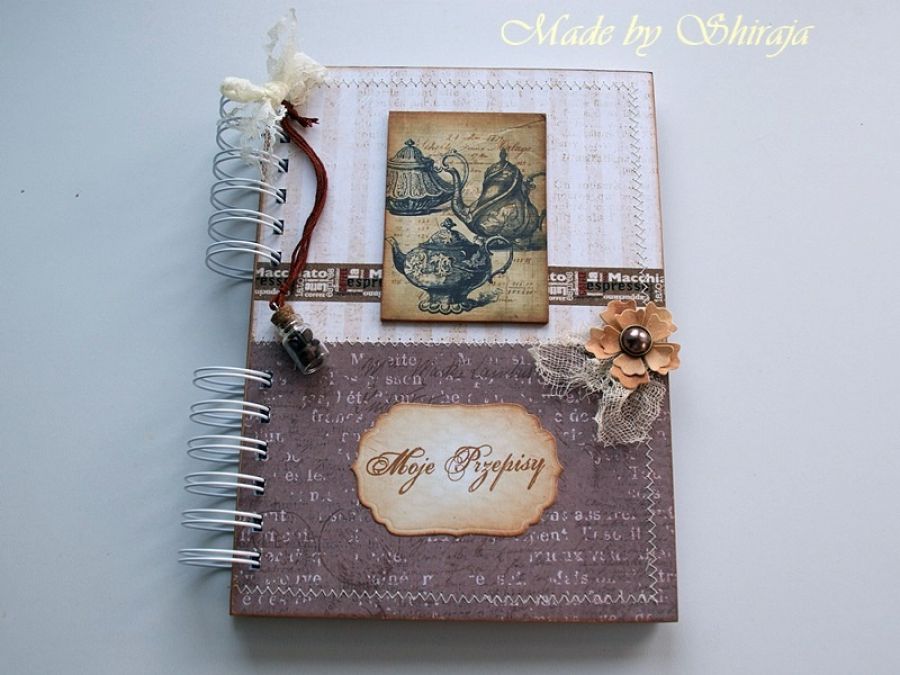 Wyjątkowy notes w formacie A5 na przepisy kulinarne . Wykonany własnoręcznie. Ozdobiony w stylu retro. Uroku dodaje zawieszka- buteleczka wypełniona ziarenkami kawy, oraz obrazek z motywem dzbanuszków. W środku ok. 100 kartek w kratkę, kieszonka na luźne kartki .