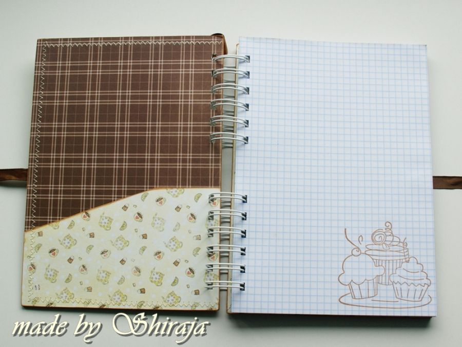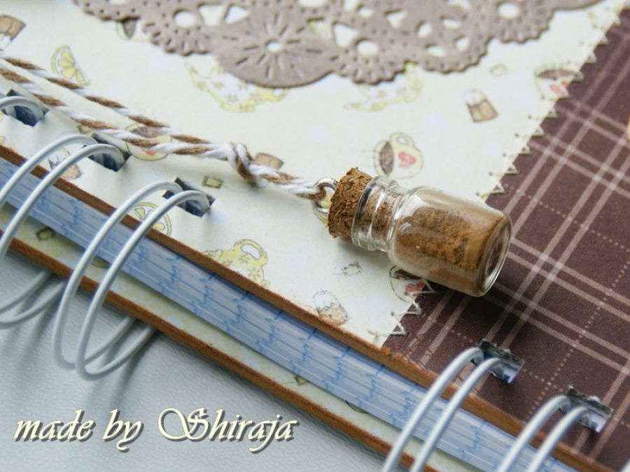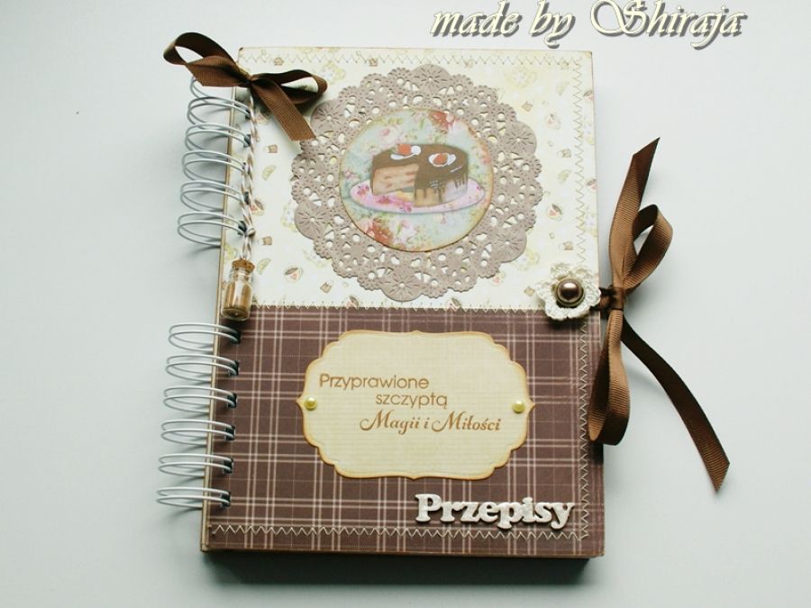 Wyjątkowy notes w formacie A5 na przepisy kulinarne. Wykonany własnoręcznie. Ozdobiony obrazkiem z motywem czekoladowego ciasta. Do tego zawieszka buteleczka wypełniona aromatycznym cynamonem. W środku ok. 100 kartek w kratkę. Niektóre kartki stemplowane motywem babeczek.