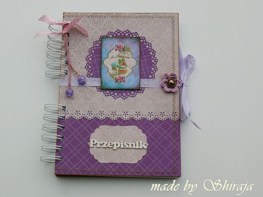 Notes formatu A5 wykonany z papierów do scrapbookingu.Obszywany maszynowo. Ozdobiony obrazkiem z motywem babeczek, oraz zawieszką z koralikami cracke. Napis pokryty perłową farbką. W środku kieszonka na luźne notatki i ok 100szt kartek w kratkę. Całość zapakowana dekoracyjnie - może być miłym upominkiem dla bliskiej osoby.