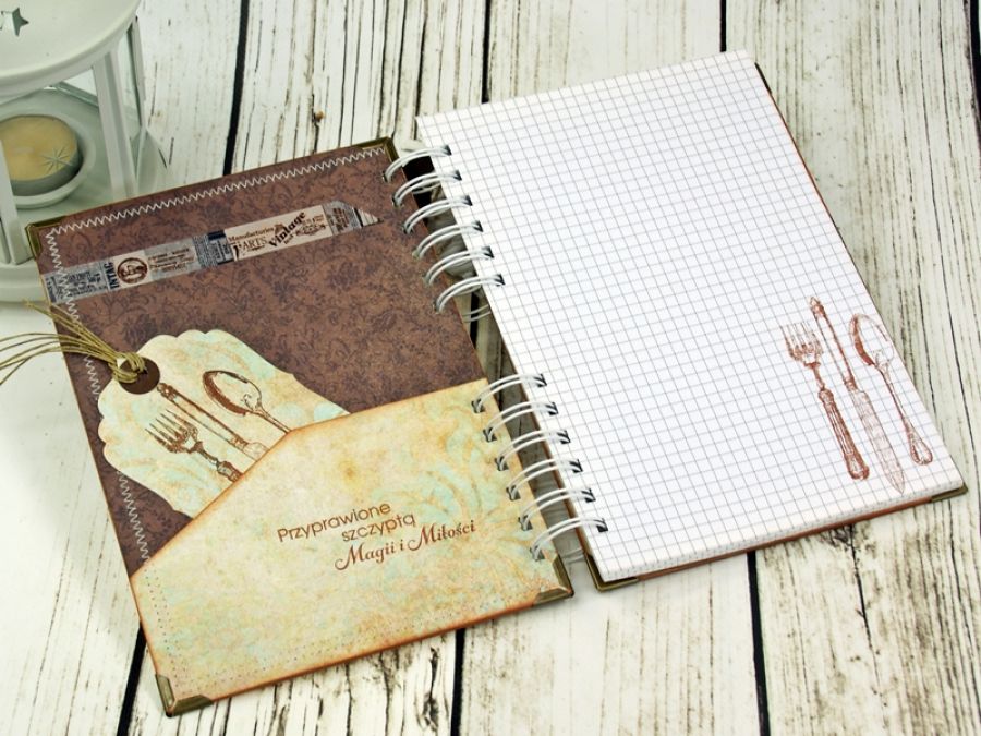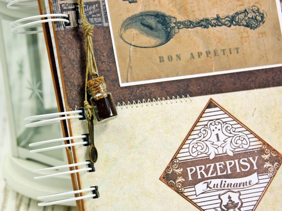 Wyjątkowy notes w formacie A5 na przepisy kulinarne. Wykonany własnoręcznie. Ozdobiony retro grafiką oraz zawieszką (buteleczka z kawą)