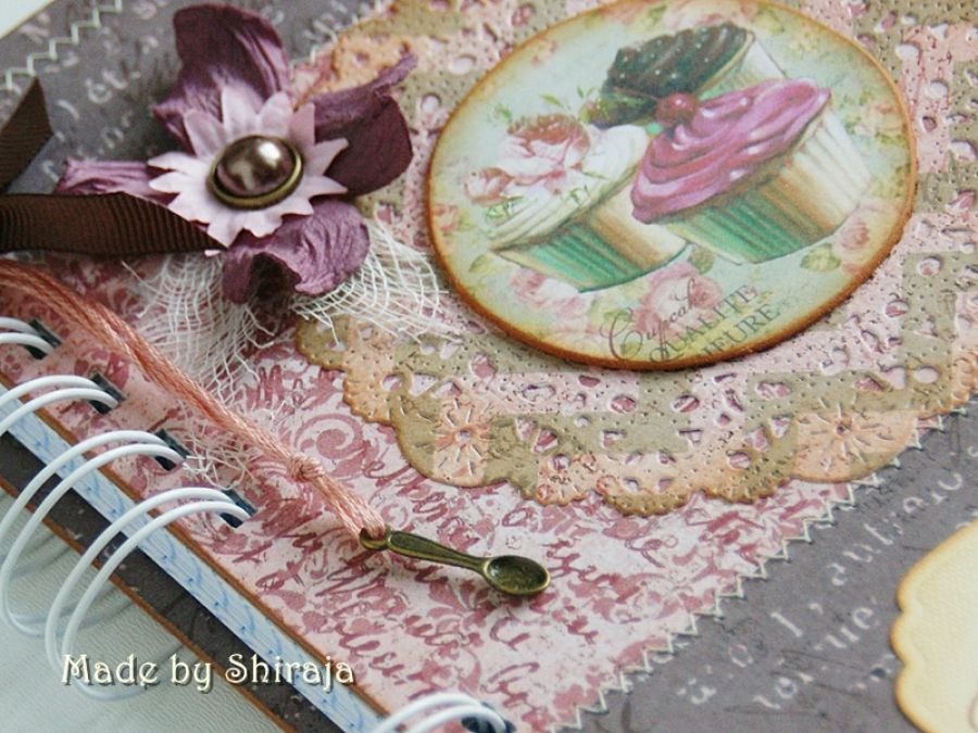 Wyjątkowy komplet, utrzymany w kolorystyce malinowo-brązowej. Wykonany własnoręcznie. Przepiśnik w formacie A5 ozdobiony obrazkiem z motywem babeczek. Do tego zawieszka urocza łyżeczka. W środku ok. 100 kartek w kratkę. Magnes na lodówkę ma wymiary: 21cmx 11cm. Utrzymany w kolorystyce przepiśnika. Karteczki można wymieniać na nowe.