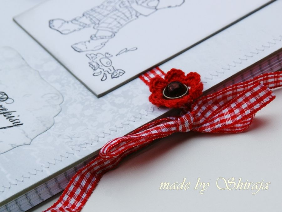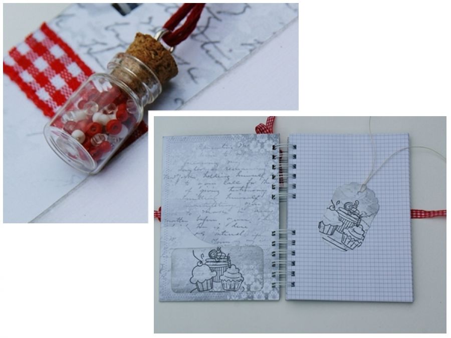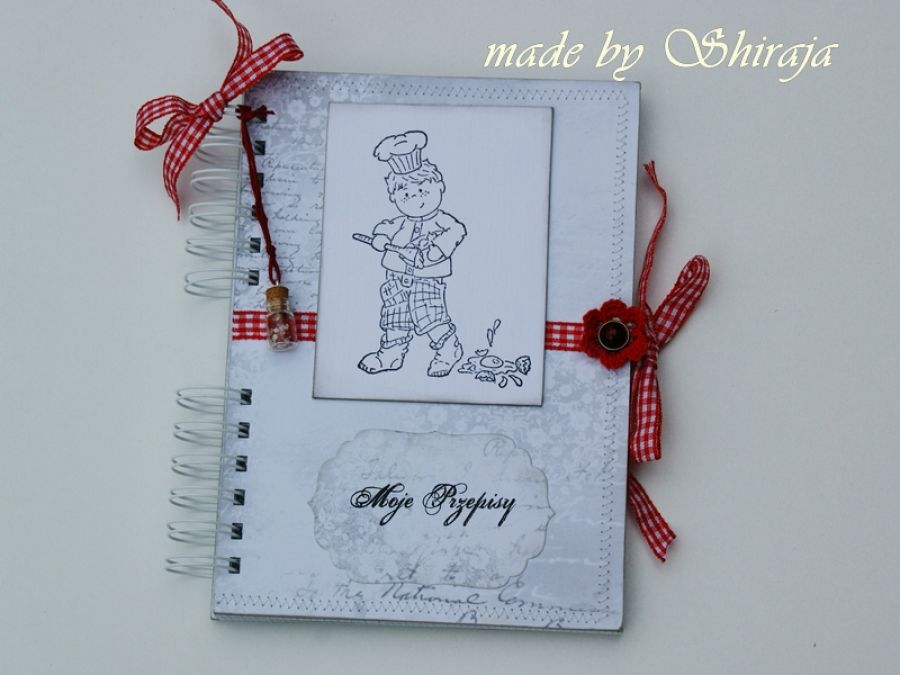 Notes formatu A5 wykonany z papierów do scrapbookingu.Obszywany maszynowo. W szarej tonacji, którą ożywiłam czerwonymi dodatkami. Ozdobiony obrazkiem z kucharzem oraz zawieszką buteleczką wypełnioną koralikami W środku kieszonka na luźne notatki i ok 100szt kartek w kratkę. Całość zapakowana dekoracyjnie - może być miłym upominkiem dla bliskiej osoby.