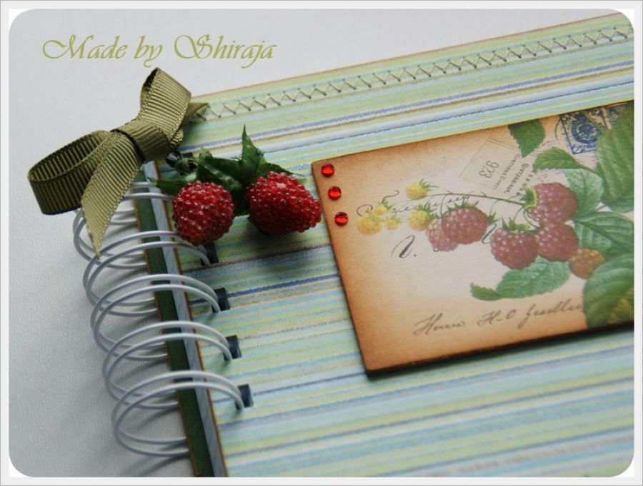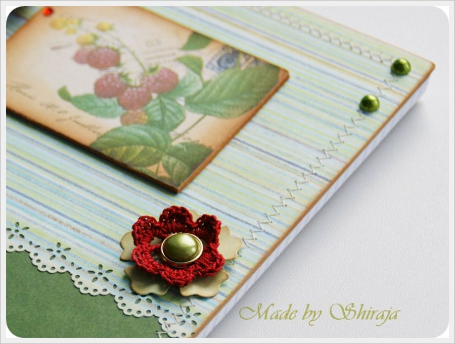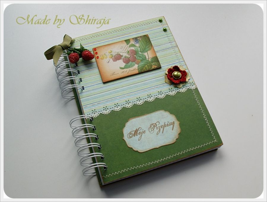Notes formatu A5 wykonany z papierów do scrapbookingu utrzymanych w kolorystyce zielono-czerwonej. Obszywany maszynowo, ozdobiony grafiką oraz owocami malin. W środku kieszonka na luźne notatki i ok 100szt kartek w kratkę.