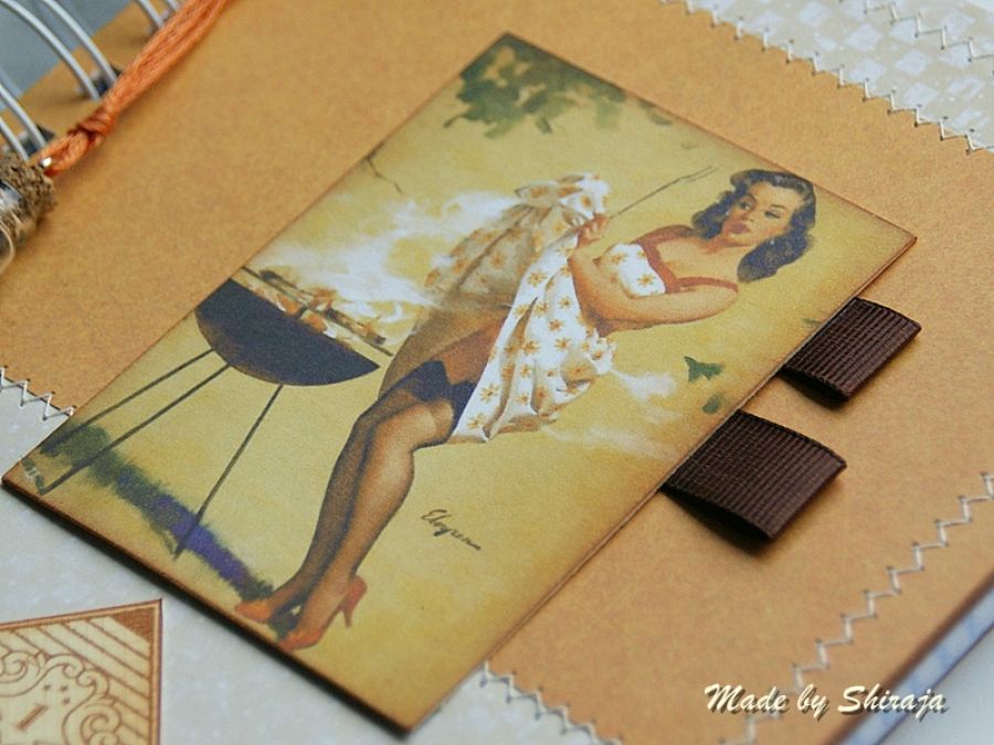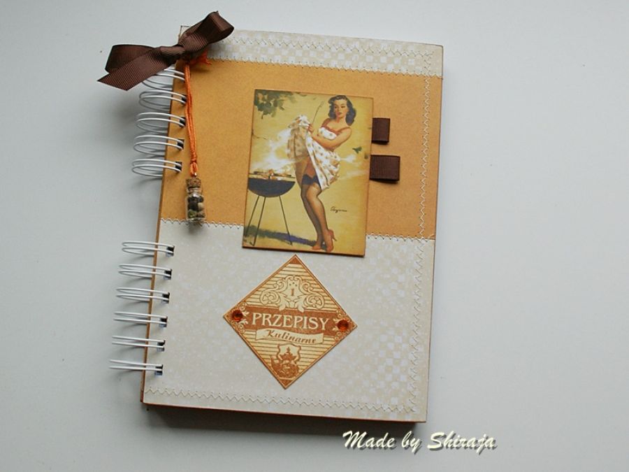 Notes formatu A5 wykonany z papierów do scrapbookingu utrzymanych w kolorystyce beżowo- pomarańczowej. Obszywany maszynowo, ozdobiony grafiką z pin up girl, oraz zawieszką- buteleczką wypełnioną ziarenkami pieprzu. W środku ok 100szt. kartek w kratkę .