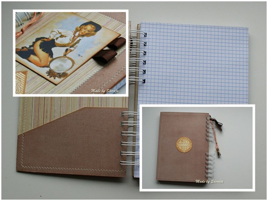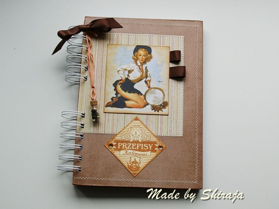 Notes formatu A5 wykonany z papierów do scrapbookingu utrzymanych w kolorystyce beżowo- bązowej. Obszywany maszynowo, ozdobiony grafiką z pin up girl, oraz zawieszką- buteleczką wypełnioną ziarenkami pieprzu. W środku ok 100szt. kartek w kratkę .