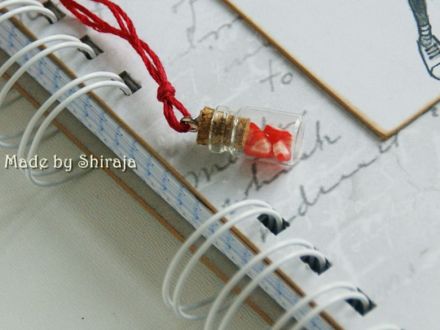 Notes formatu A5 wykonany z papierów do scrapbookingu. Obszywany maszynowo. W tonacji szaro-czerwonej. Ozdobiony obrazkiem z uroczą pszczółką (projekt autorski) oraz zawieszką buteleczką wypełnioną plasterkami truskawek. W środku kieszonka na luźne notatki i ok 100szt kartek w kratkę. Notes może być miłym upominkiem dla bliskiej osoby.