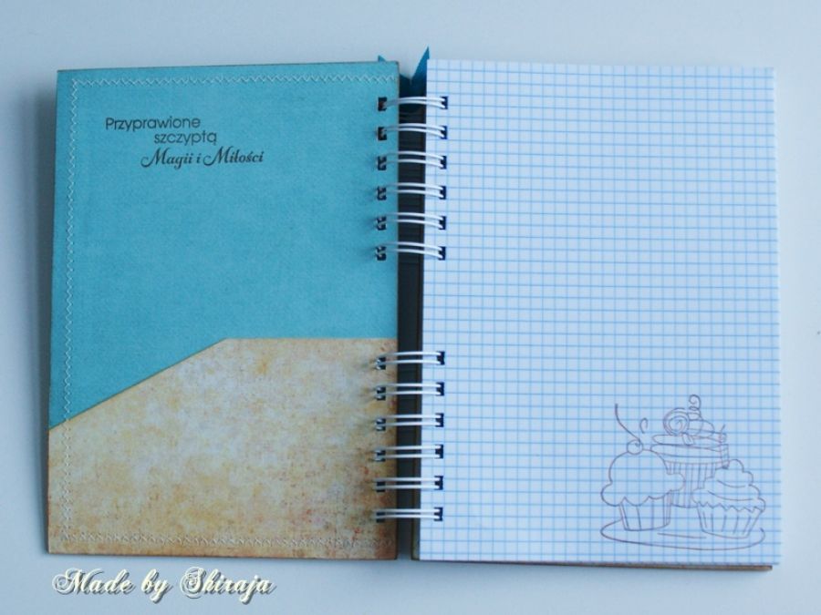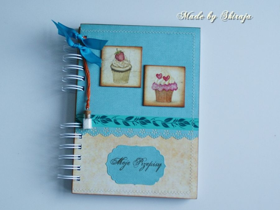 Wyjątkowy notes w formacie A5 na przepisy kulinarne. Wykonany własnoręcznie. Utrzymany w kolorystyce turkusowo-pomarańczowej. Uroku dodaje grafika ze smakowitymi babeczkami, oraz zawieszka buteleczka wypełniona cukrem waniliowym. W środku ok. 100 kartek w kratkę (niektóre stemplowane) oraz kieszonka na luźne kartki.