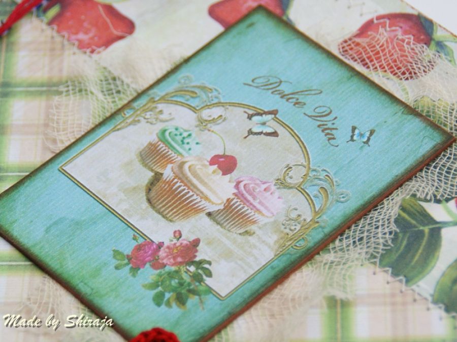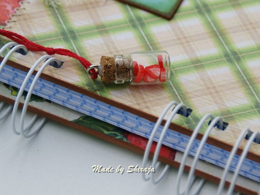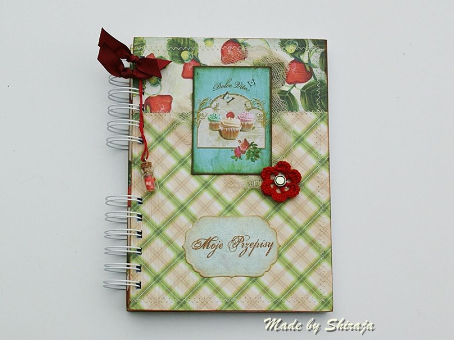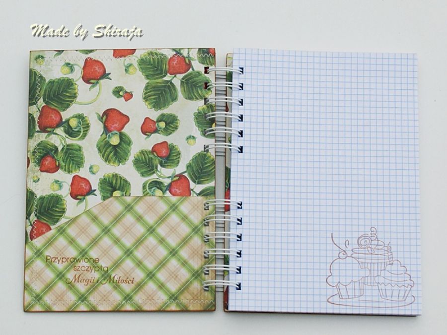 Notes formatu A5 wykonany z papierów do scrapbookingu w soczyście owocowych kolorach. Obszywany maszynowo, ozdobiony smakowitymi truskawkami zawieszką buteleczką wypełnioną plasterkami truskawek . W środku kieszonka na luźne notatki i ok 100szt kartek w kratkę. Notes może być miłym upominkiem dla osoby kochającej gotowanie.