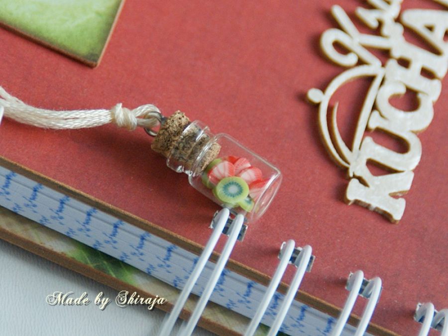 Wyjątkowy notes w formacie A5 na przepisy kulinarne. Wykonany własnoręcznie. Uroku dodaje grafika ze smakowitymi babeczkami oraz zawieszka buteleczka wypełniona plasterkami truskawek i kiwi.. W środku ok. 100 kartek w kratkę oraz kieszonka na luźne kartki.