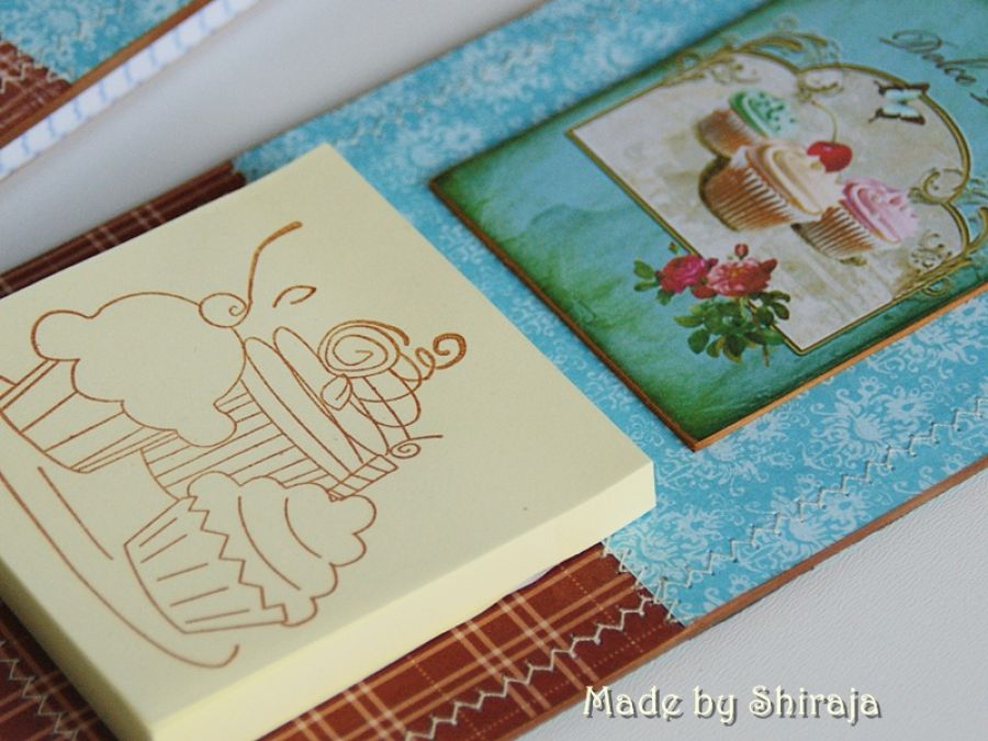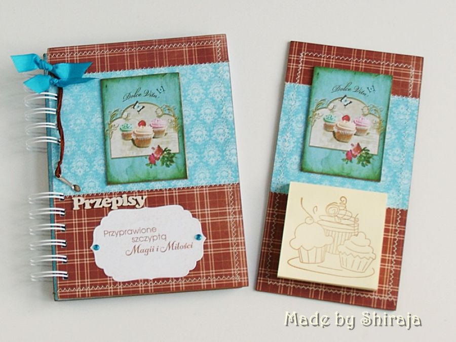 Wyjątkowy komplet, utrzymany w kolorystyce turkusowo-brązowej. Wykonany własnoręcznie. Przepiśnik w formacie A5 ozdobiony obrazkiem z motywem babeczek. Do tego zawieszka urocza łyżeczka. W środku ok. 100 kartek w kratkę. Magnes na lodówkę ma wymiary: 21cmx 11cm. Utrzymany w kolorystyce przepiśnika. Karteczki można wymieniać na nowe.