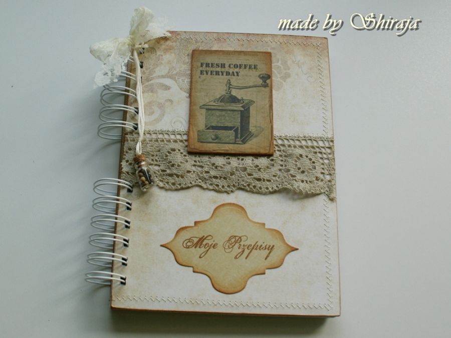 Wyjątkowy notes w formacie A5 na przepisy kulinarne . Wykonany własnoręcznie. Ozdobiony w stylu retro. Uroku dodaje zawieszka- buteleczka wypełniona kolorowym pieprzem, oraz obrazek z motywem młynka. W środku ok. 100 kartek w kratkę, kieszonka na luźne kartki. Niektóre kartki ozdobione ręcznie stemplowanym motywem.