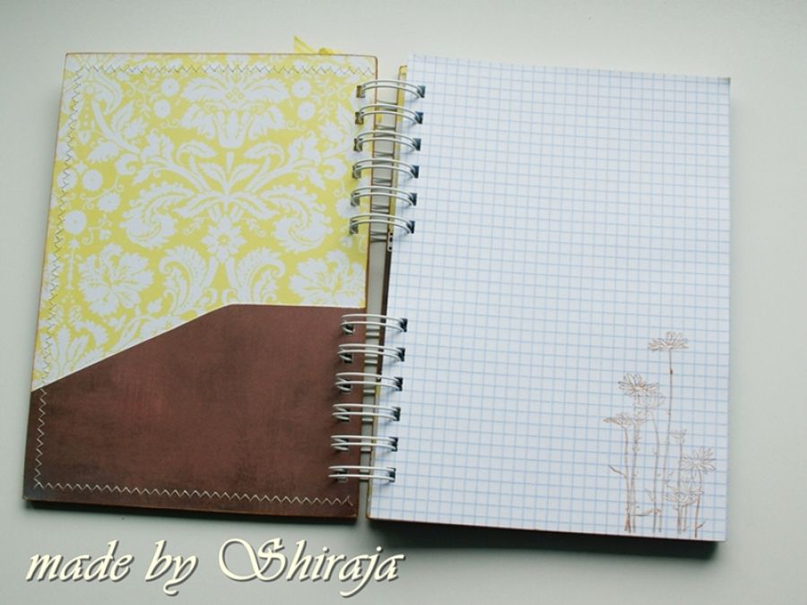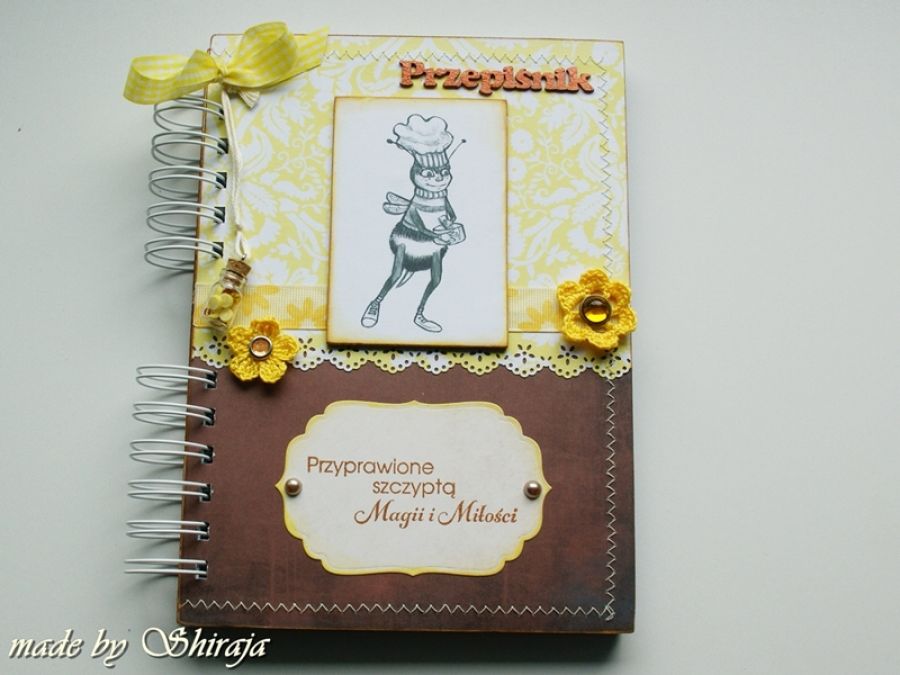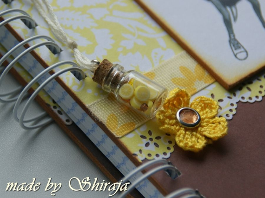 Notes formatu A5 wykonany z papierów do scrapbookingu utrzymanych w kolorystyce cytrynowo-czekoladowej. Obszywany maszynowo, ozdobiony rysunkiem zabawną pszczółką (projekt autorski) oraz zawieszką - buteleczką wypełnioną plasterkami cytryny i koralikami. W środku kieszonka na luźne notatki i ok 100szt kartek w kratkę. Całość zapakowana dekoracyjnie - może być miłym upominkiem dla bliskiej osoby.