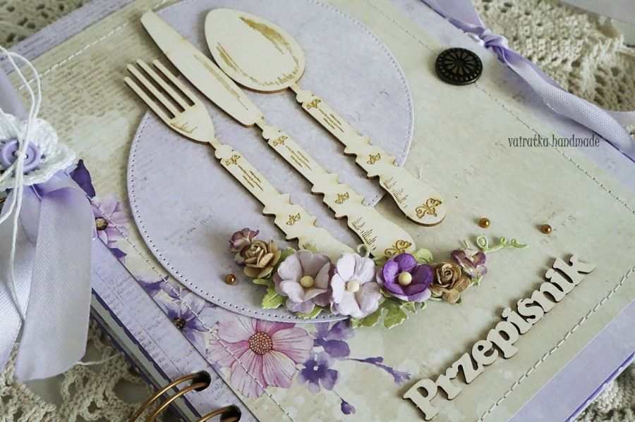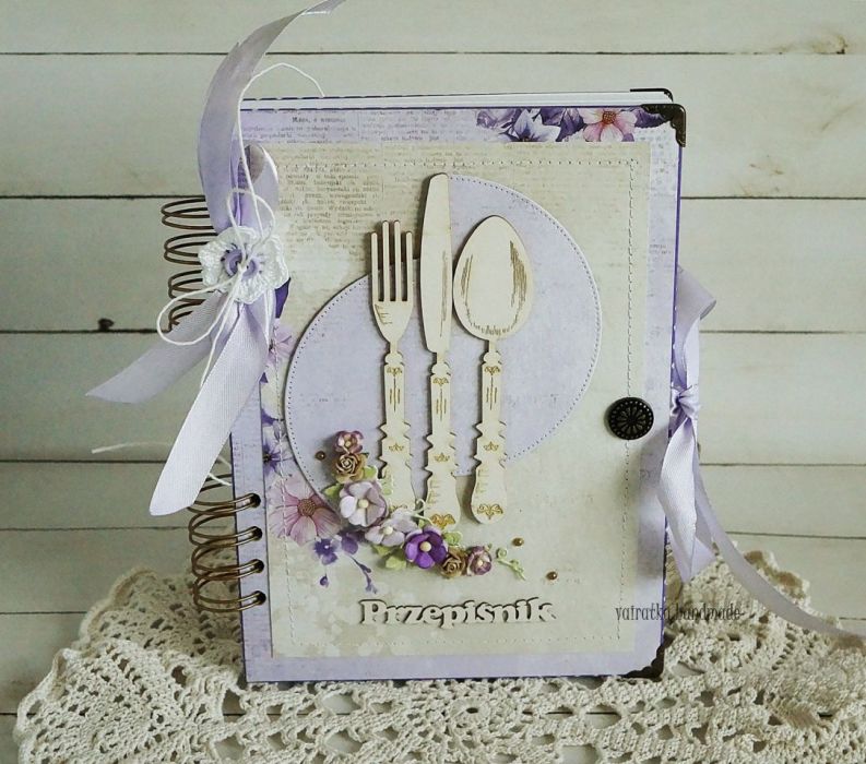 Na okładce - tekturowe sztućce. Ozdobiony przeszyciami i ozdobnym metalowym ćwiekiem. Kompozycja ze sztućcami przestrzenna, poszczególne elementy podklejone kosteczkami 3d. Papierowe kwiaty. Notes zapinany na cienką gumkę. Sprężyny ozdobione wstążeczkami.