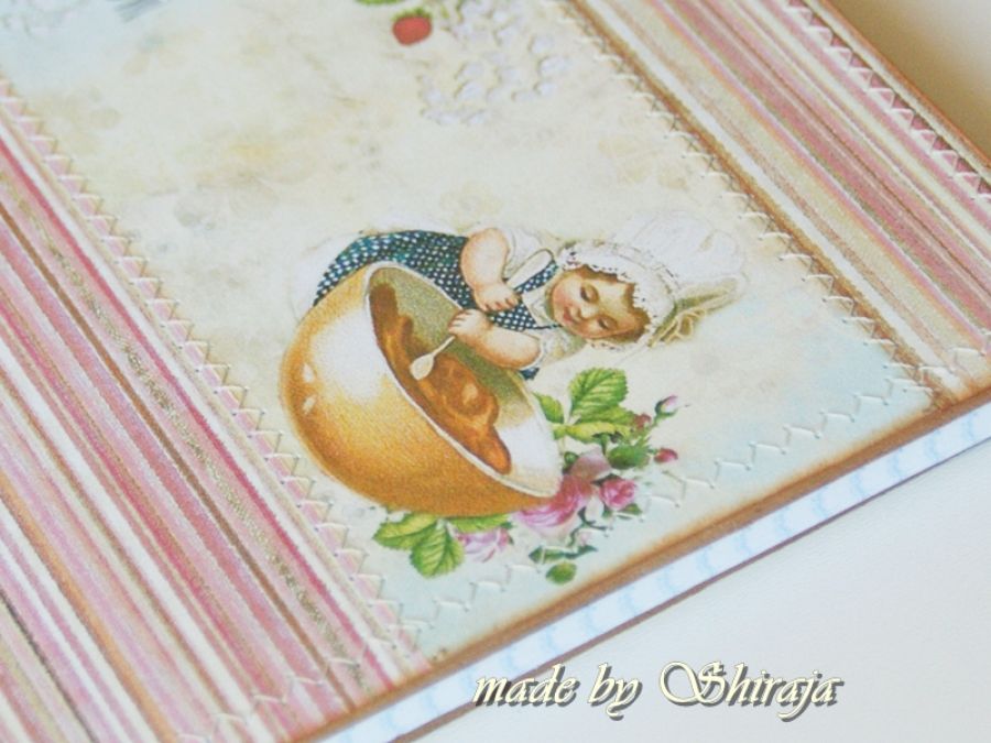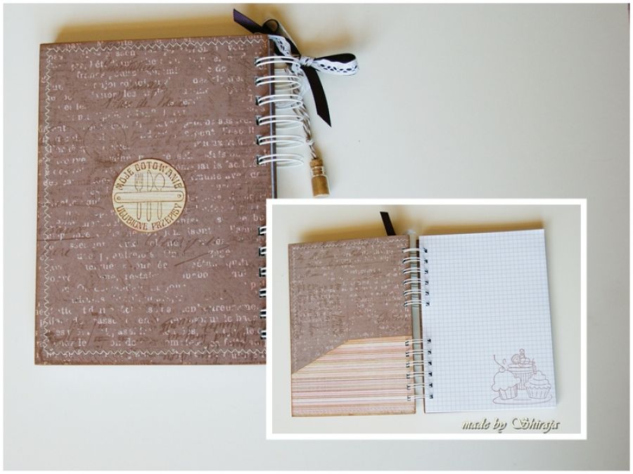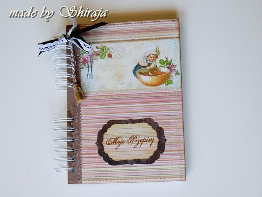 Wyjątkowy notes w formacie A5 na przepisy kulinarne . Wykonany własnoręcznie. Ozdobiony obrazkiem z uroczą kuchareczką. Do tego zawieszka buteleczka wypełniona aromatycznym cynamonem. W środku ok. 100 kartek w kratkę. Niektóre kartki stemplowane motywem babeczek.