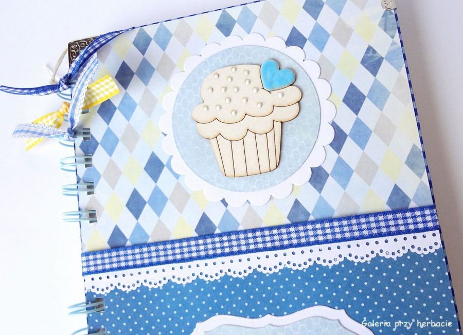 Przepiśnik zbindowany sprężyną, okładki z grubej tektury, ozdobiony wysokiej jakości papierami do scrapbookingu i wstążkami.
