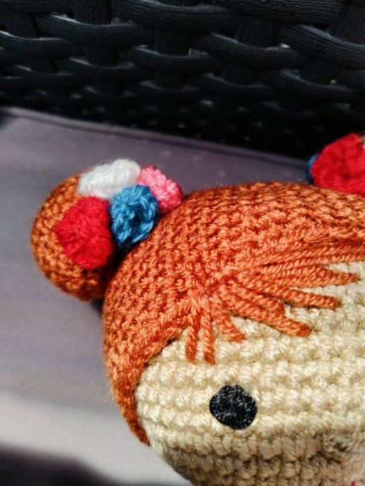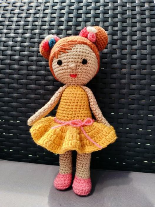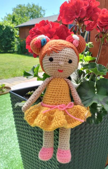Lalka ręcznie robiona na szydełku. W kolorach miodowej sukienki różowe buciki kasztanowe włoski z dwoma koczkami Z włóczki polyacryl plus bambus. Wysokość laleczki 28 cm.
