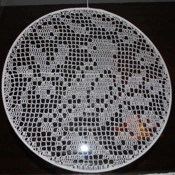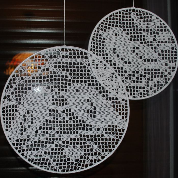 Zestaw dekoracyjny na okno wykonany na szydełku, w którego skład wchodzą: zazdrostka o wymiarach 52x52 cm oraz 3 obręcze 23cm, 30cm i 35 cm.